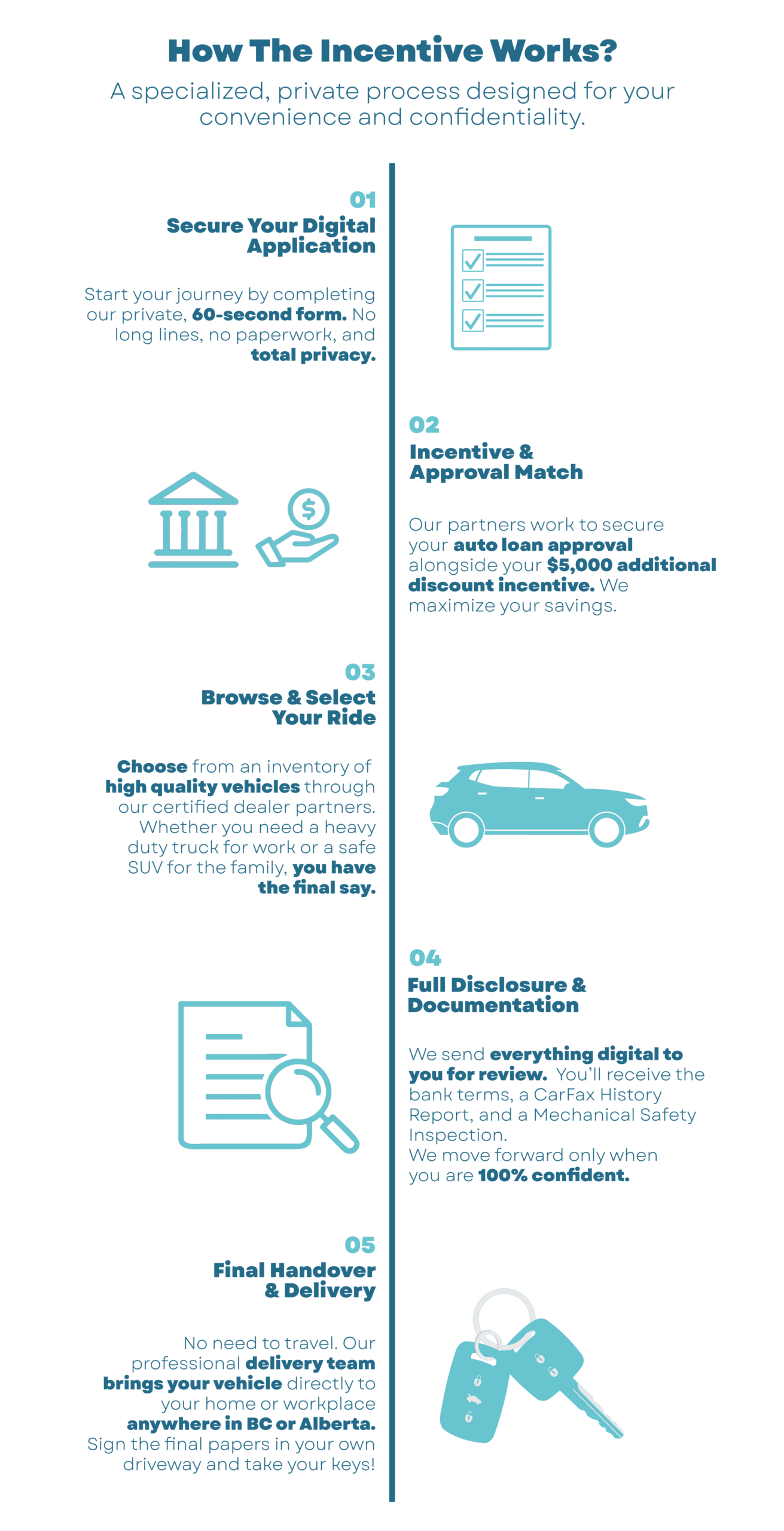 A: No. We bring the showroom to you. > The First Nations Auto Loan is designed for maximum convenience. From your initial application to vehicle selection and document review, everything is handled digitally. Once the process is complete, our professional delivery team will transport your vehicle directly to your home or workplace anywhere in BC or Alberta. You sign the final handover papers right in your own driveway.